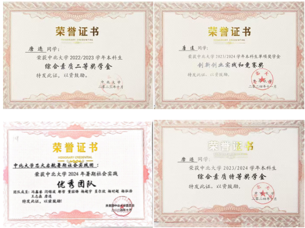 唐连,四川南充人,中北大学半导体与物理学院微电子科学与工程专业2022级学生,平均学分绩点4.24,专业排名1/149,顺利通过了英语四六级考试。大学期间,获得国家励志奖学金、综合素质特等奖学金、望山奖学金等多项奖励,获得优秀共青团员荣誉称号。在科技竞赛中荣获国家级奖项3项,省级奖项6项。现已推免至复旦大学集成电路与微纳电子创新学院攻读博士学位。