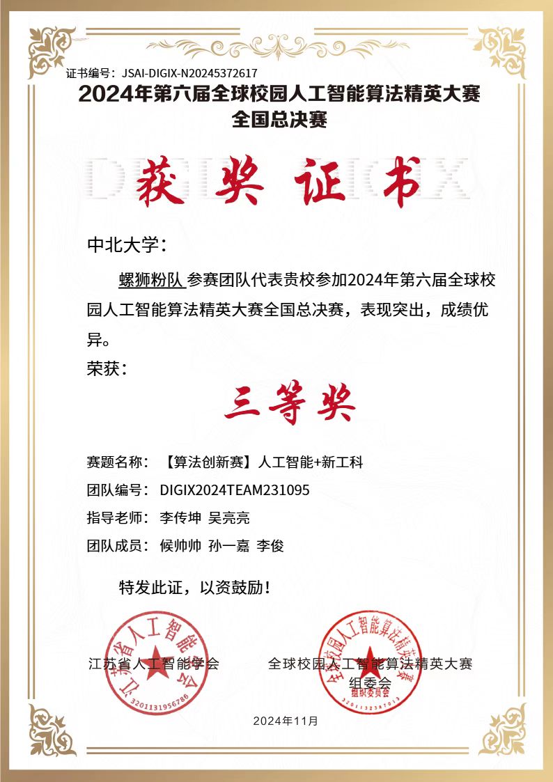 候帅帅,山西运城人,中北大学半导体与物理学院微电子科学与工程专业22级学生,现任24级微电子科学与工程专业研究生朋辈辅导员,曾任半导体与物理学院科创中心副主席。平均学分绩点3.41(专业排名17/149),大学期间曾获“明石杯”微纳传感技术与智能应用赛全国一等奖、睿康机器人开发者大赛全国二等奖、全球校园人工智能算法精英大赛全国三等奖等奖项。现通过贯通培养在本校攻读硕士学位。