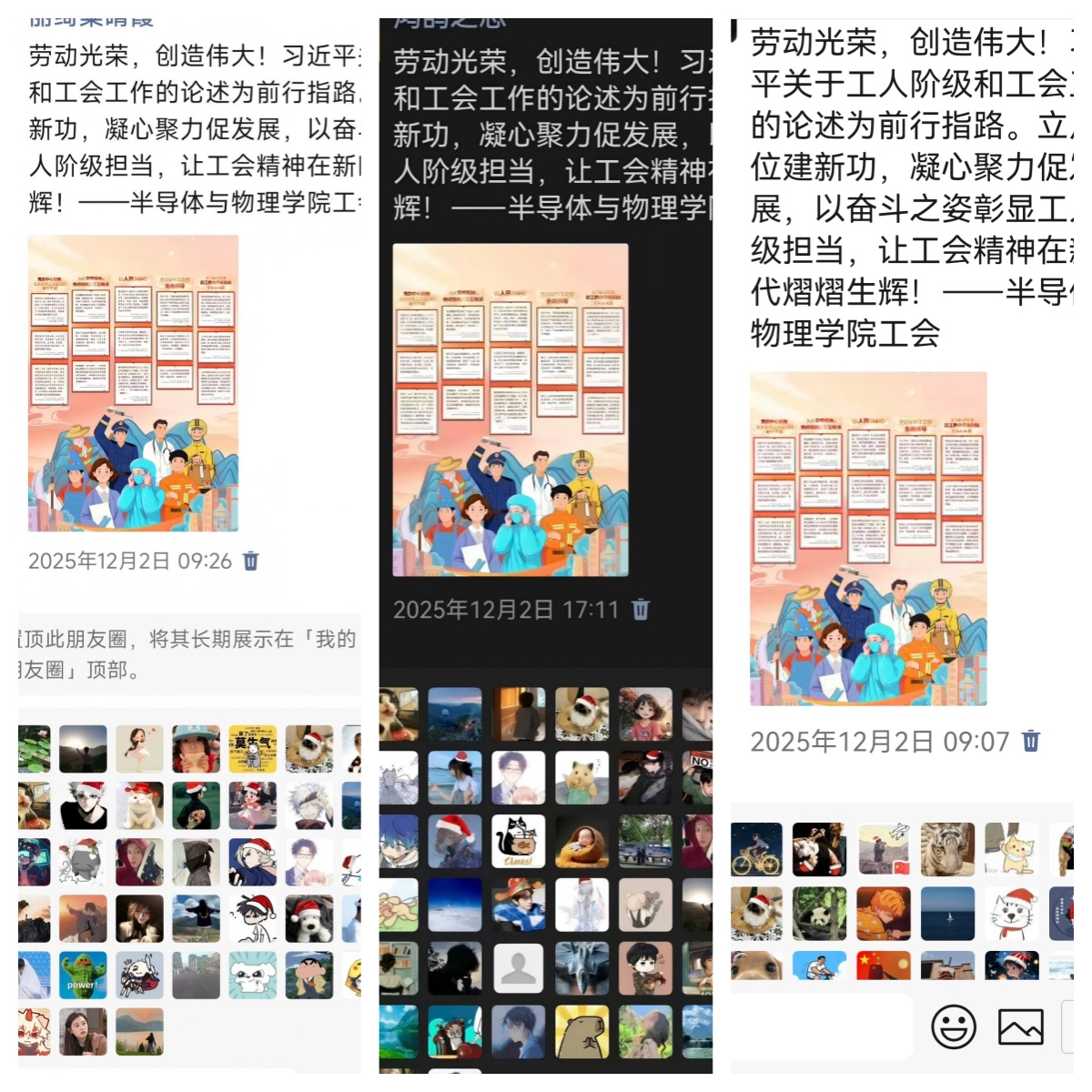 短短两天,转发量超90余次,教职工结合岗位实际分享学习心得:“作为半导体材料研究者,要以‘不懈奋斗’精神突破技术瓶颈”“立足讲台育英才,就是工人阶级担当的最好体现”,形成线上比学赶超的浓厚氛围。“朋友圈的感悟要变成实验室的突破,这才是对工会精神的最好传承。” 学院工会主席表示。