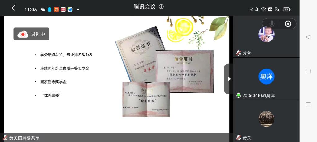 曾获“校园新冠疫情防疫优秀志愿者”荣誉的矦芳芳同学展示了自己大学生活期间做过的志愿活动,还传授同学们做志愿活动的方法,使大一新生更加了解志愿活动的内容。除了志愿活动,矦芳芳同学还从“自律能力,合理的时间安排,资源利用”三方面分享了自己的学习经验以此告诫同学们学习的重要性。