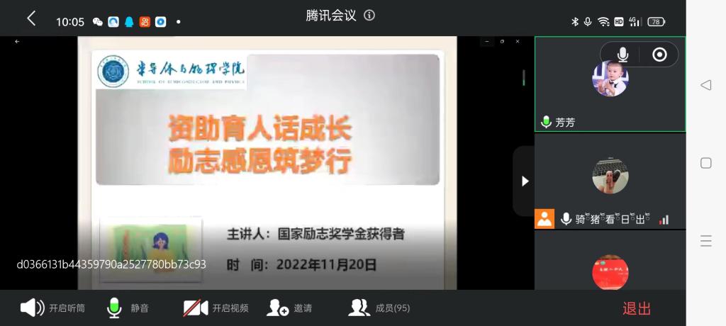 2022年11月20日上午10:00,半导体与物理学院举行了主题为“资助育人话成长,励志感恩筑梦行”的活动。由于疫情防控,本次活动采取线上举行, 21级与22级全体同学、国家励志奖学金获奖者都参加了本次活动。