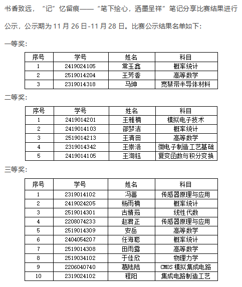 本次“书香致远,‘记’忆留痕”优秀笔记评选活动不仅充分展示了学生们多样化的学习方法和总结,也让更多的同学认识到良好学习习惯的重要性。活动激励同学们以更加积极的态度面对大学学习过程中的各种挑战,在知识的海洋里不断探索。 半导体与物理学院微电子科学与工程党支部通过此次评选活动,成功地激发了学生的学习热情,提升了学术素养,为营造积极向上的学习氛围做出了积极贡献。