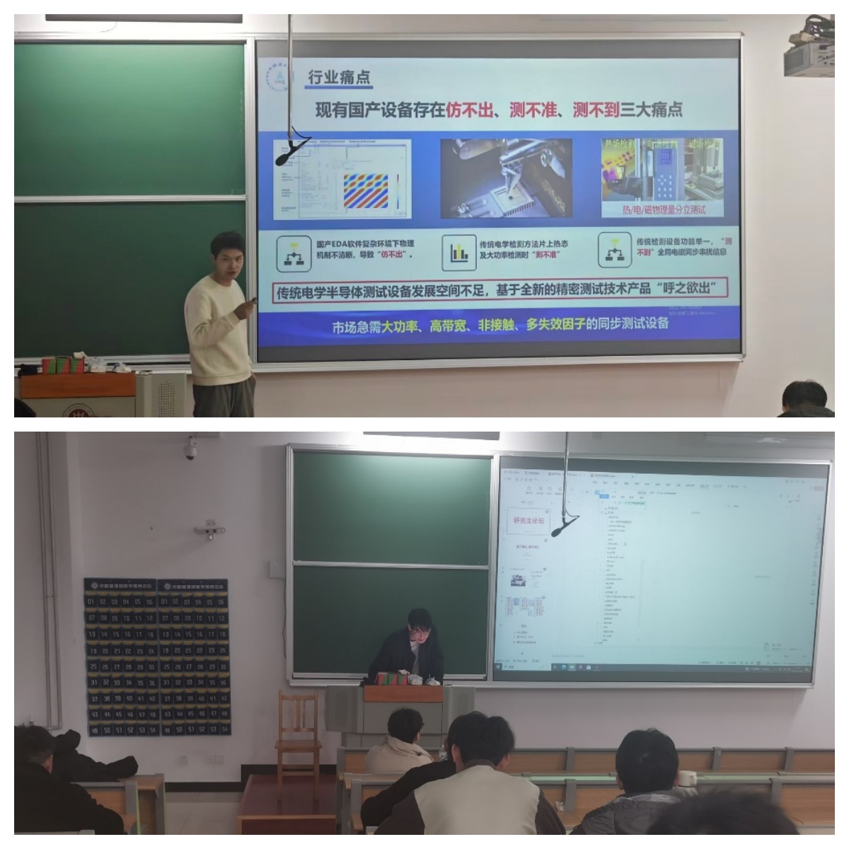 论坛上半场,刘滔同学从我国当前半导体行业面临的测试难题出发,为同学们详细介绍了我院在半导体测试领域的强劲实力。从面对问题、提出方案、实验研究、落地实施,他详细展示了我院团队如何通过创新的仿真算法和测试方案,实现对半导体设备的精密测量。并且刘滔同学结合专业前景为同学们深入分析了在工作就业方面的一些疑惑,给在场同学留下了深刻印象。