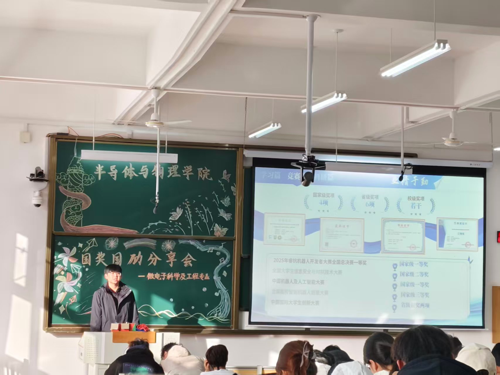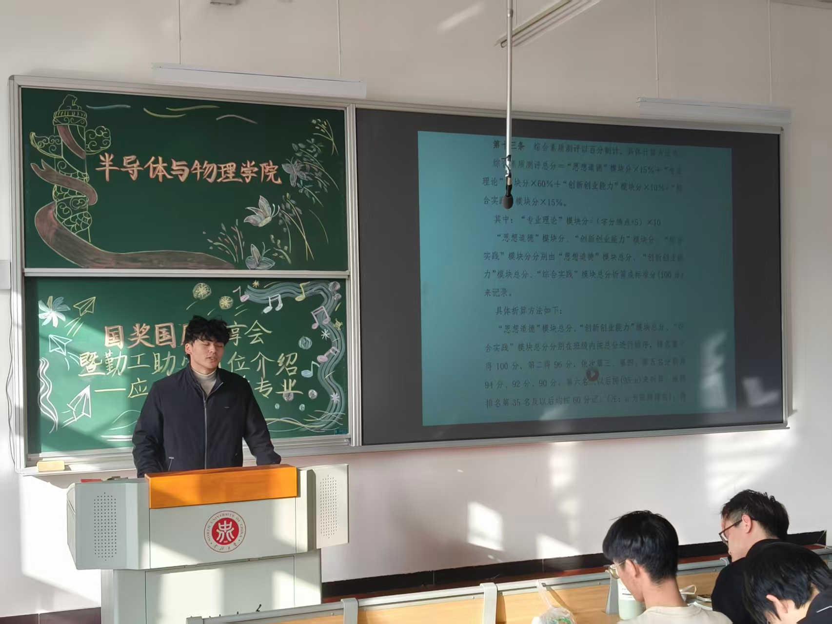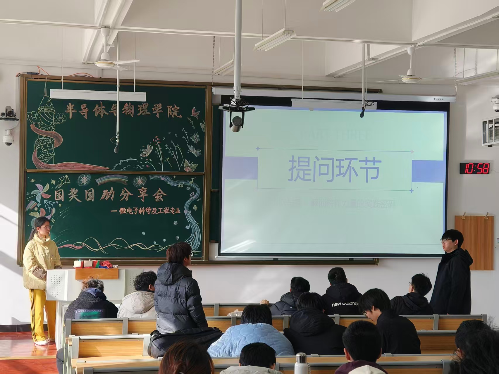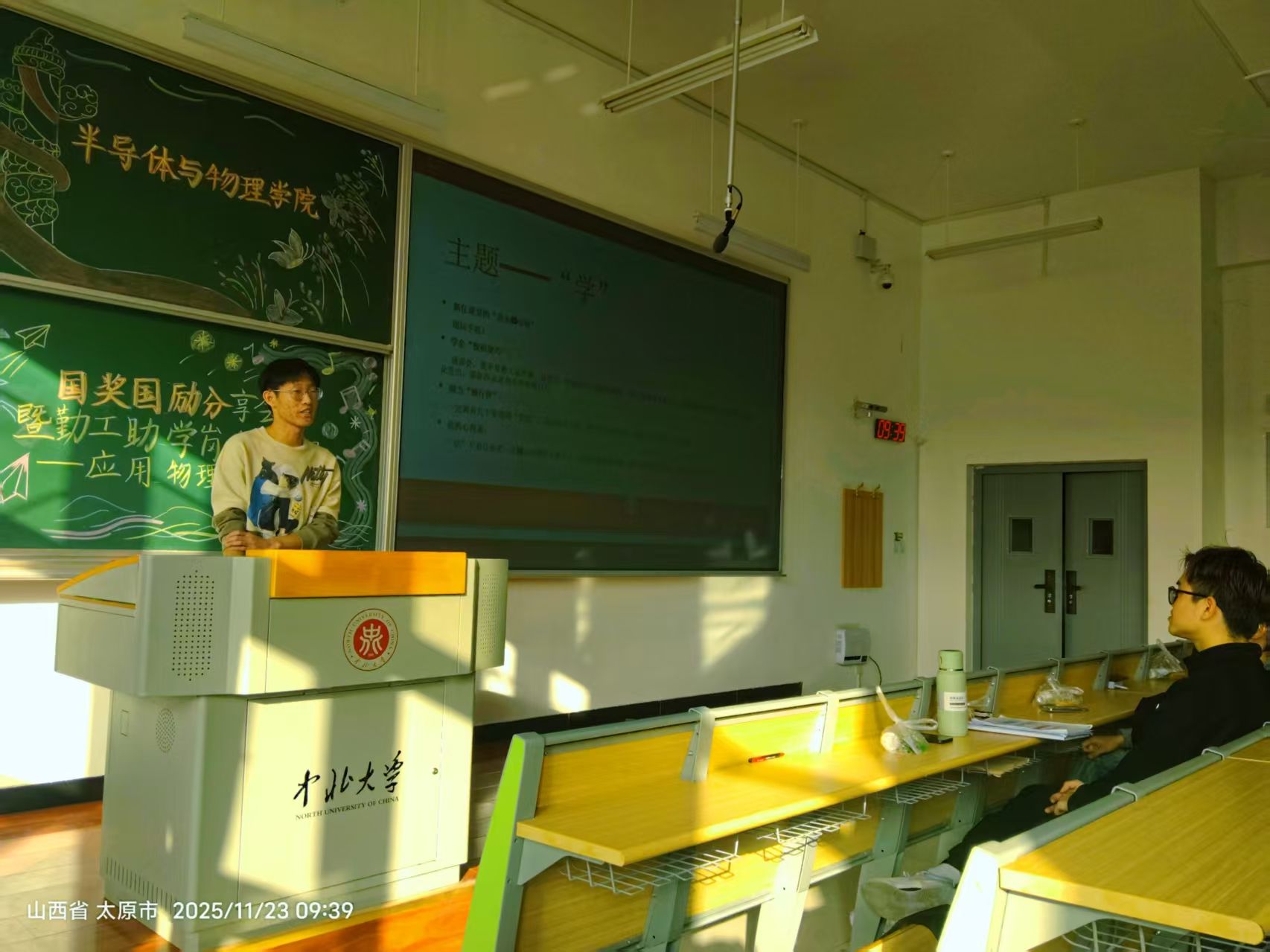 11月23日,半导体与物理学院助学部在王老师的指导下,于教学楼17105H/17101H/17102H教室举办了以“逐光而上,筑梦远航”为主题的微电子科学与工程、集成电路设计与集成系统、以及应用物理学三个专业国奖国励获得者学习经验分享会。本次活动邀请了我院三位2025年国家奖学金获得者及六位2025年国家励志奖学金获得者分享经验,为25级新生提供全面成长参考。