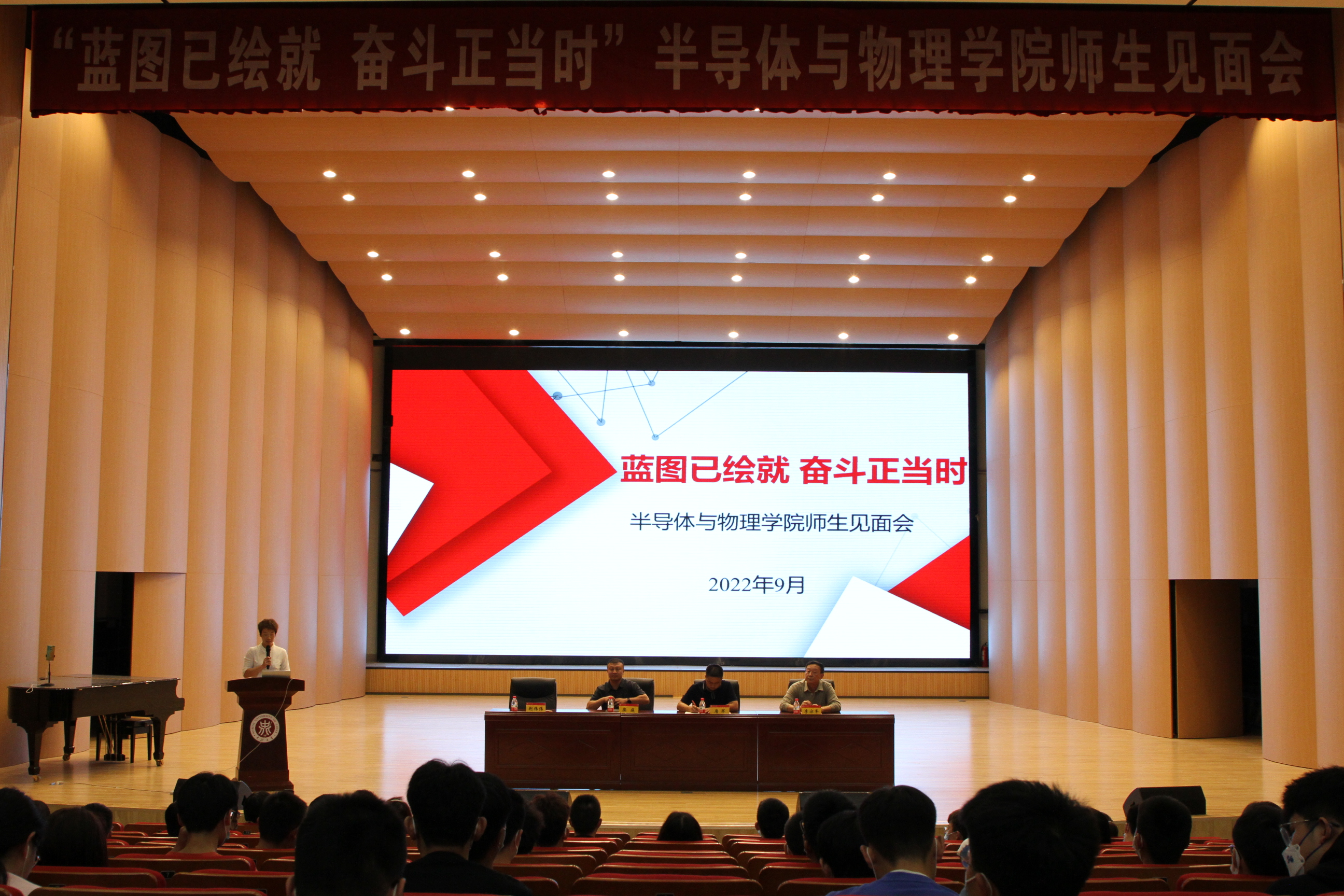 2022年9月29日下午5:00,半导体与物理学院开学典礼暨学风建设大会在9号楼09302H举行。学院副院长唐军教授、学科带头人李亦军教授、梁庭副教授,新生班主任及半导体与物理学院全体2022级本科生研究生参加了会议。会议由荆伟伟老师主持。