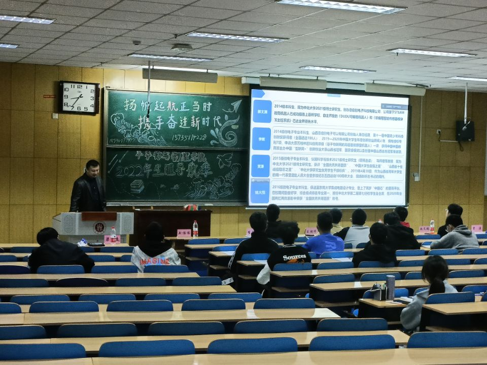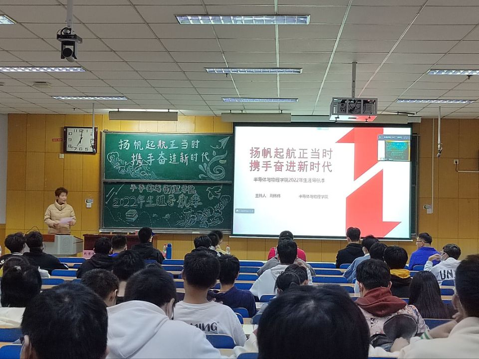 2022年10月16日下午7:00,半导体与物理学院“扬帆起航正当时,携手奋进新时代”——半导体与物理学院2022年生涯导航季在11号楼11108H举行。半导体与物理学院全体2022级本科生参加了会议。