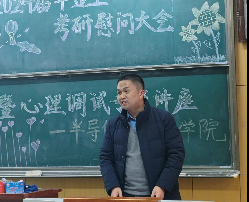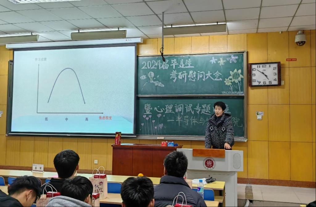 为增强考研学子信心,缓解焦虑情绪,更好地规划余下阶段的考研学习,12月12日下午4:30,半导体与物理学院于11309H举办了2024届毕业生考研慰问大会暨心理调试专题讲座。半导体与物理学院副院长唐军、团委书记荆伟伟老师、2024届各班班主任、辅导员,2024届考生参加了此次活动。活动由学院团委副书记王旭老师主持。