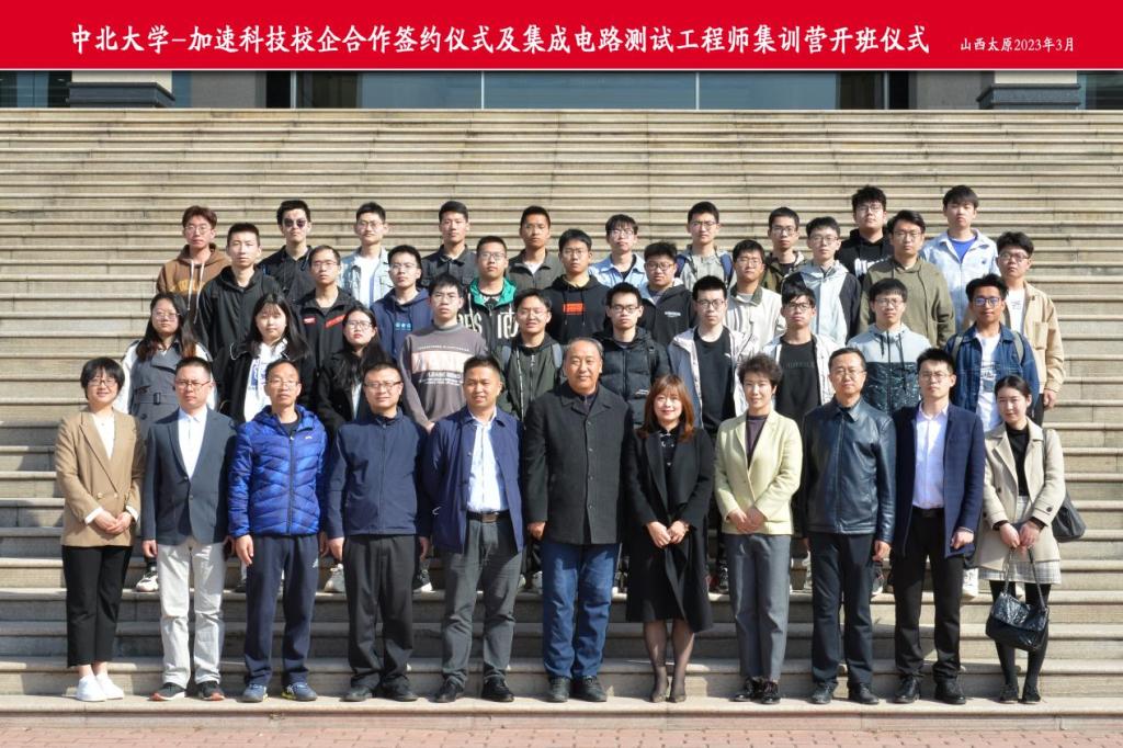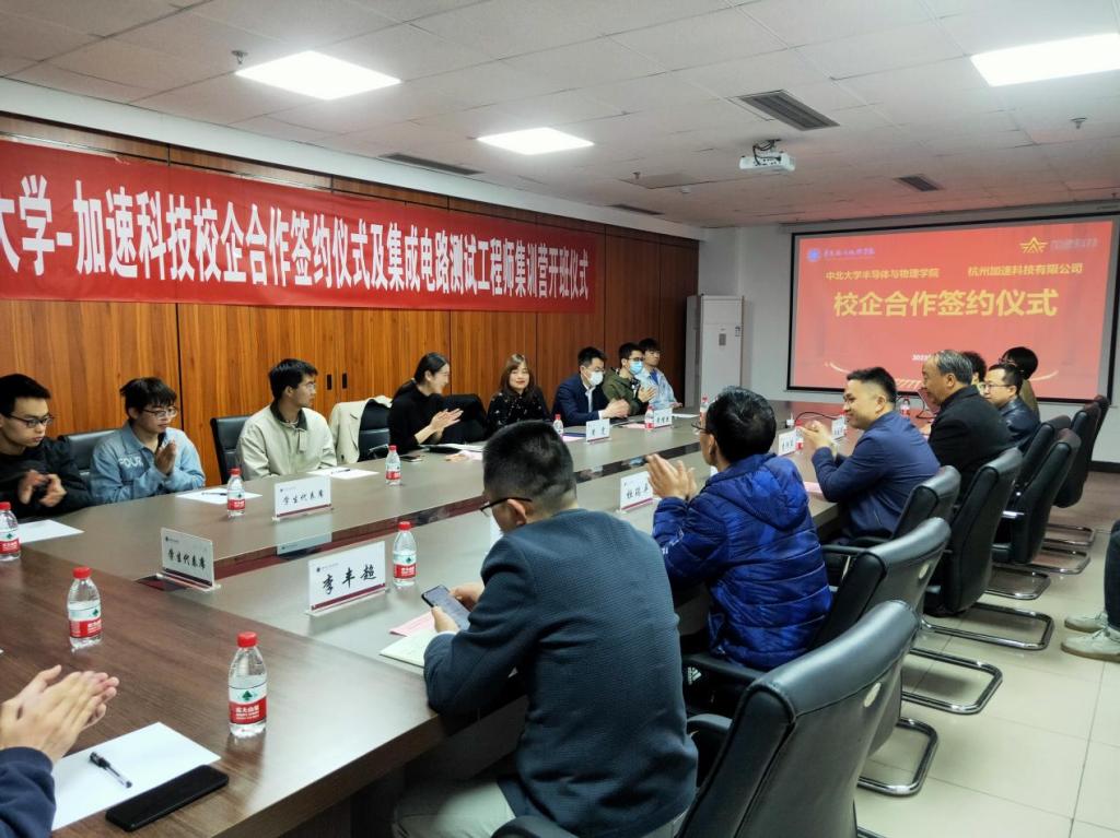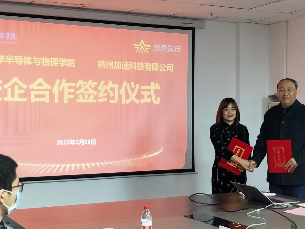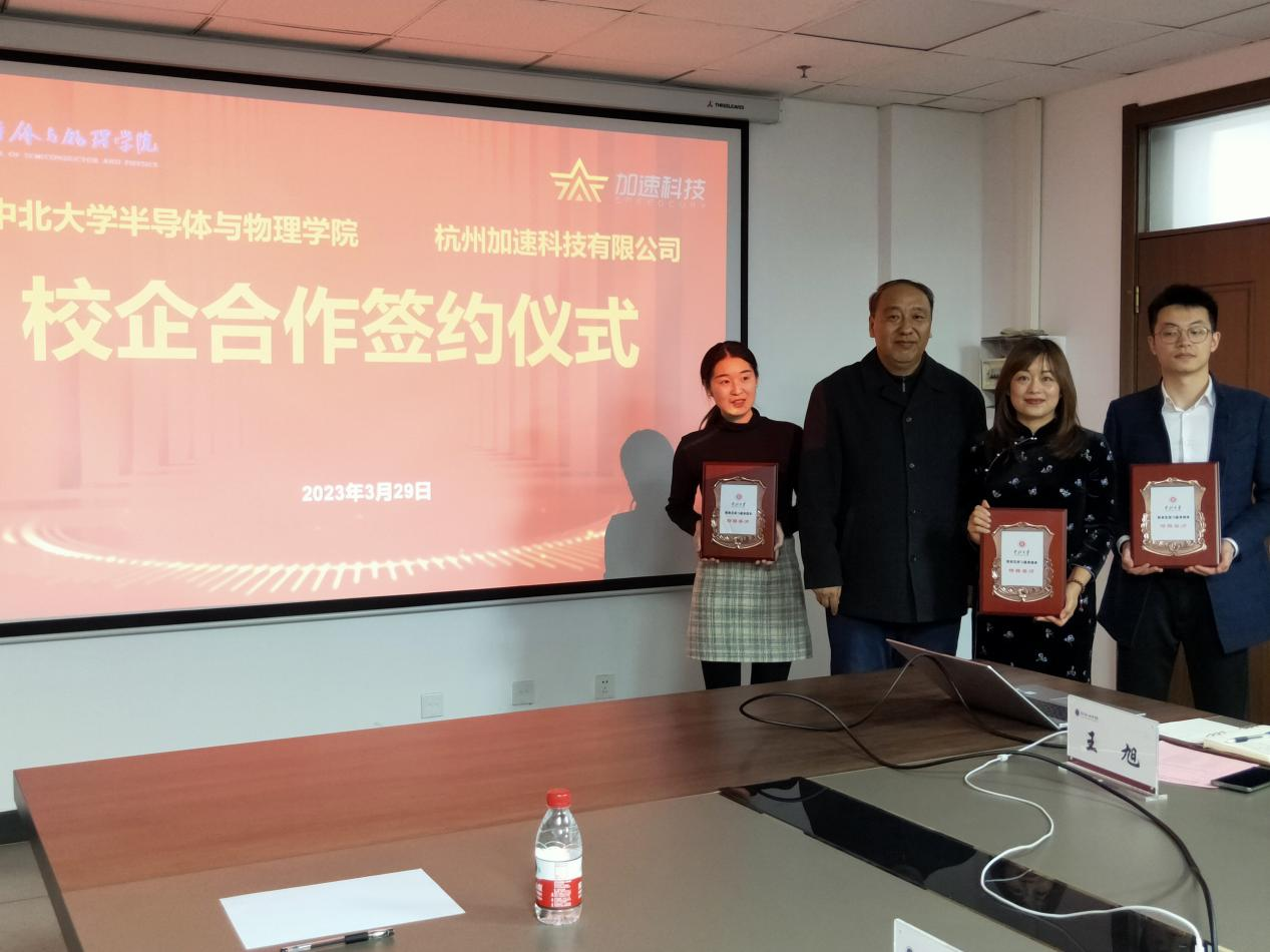 3月29日上午,中北大学半导体与物理学院与杭州加速科技有限公司在主楼1319会议室签署校企合作战略协议,中北大学半导体与物理学院党委书记李仰军、副院长唐军、专业教师、团学队伍以及杭州加速科技有限公司教育事业部总经理黄雯、培训总监黄楷然、销售经理孔娟等出席会议,会议由半导体与物理学院团委书记荆伟伟主持。