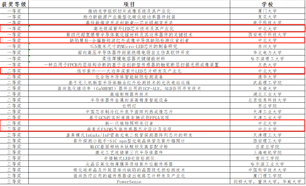 自今年8月启动以来,半导体领域专项赛事吸引了来自清华大学、复旦大学、厦门大学等全国60多所高校130多支队伍报名参与。中北大学双创学院和半导体与物理学院高度的广泛动员与精心组织,我校共有14支队伍参赛,最终获得一等奖2项,二等奖2项,三等奖1项,中北大学获得“优秀组织奖”,获得一等奖的团队晋级2023首届企校协同创新大赛全国总决赛。具体获奖名单如下: