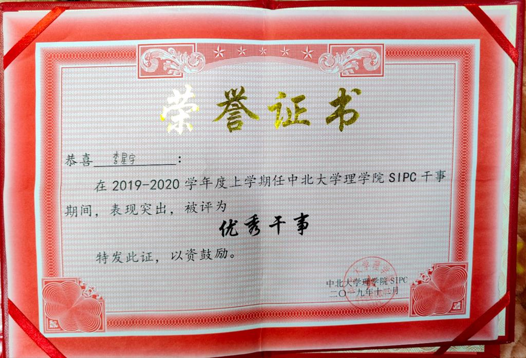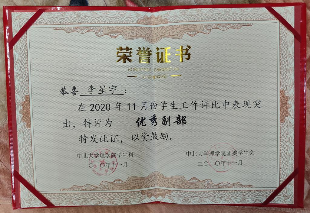 荣获2019-2020 学年中北大学理学院分科协“优秀干事”