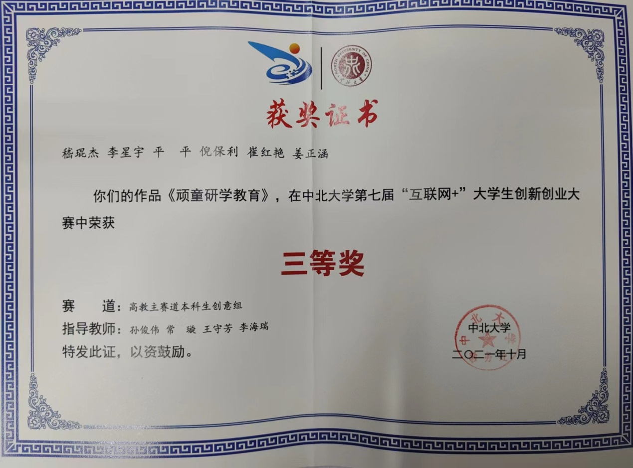 荣获中北大学第七届“互联网+”大学生创新创业大赛中荣获三等奖