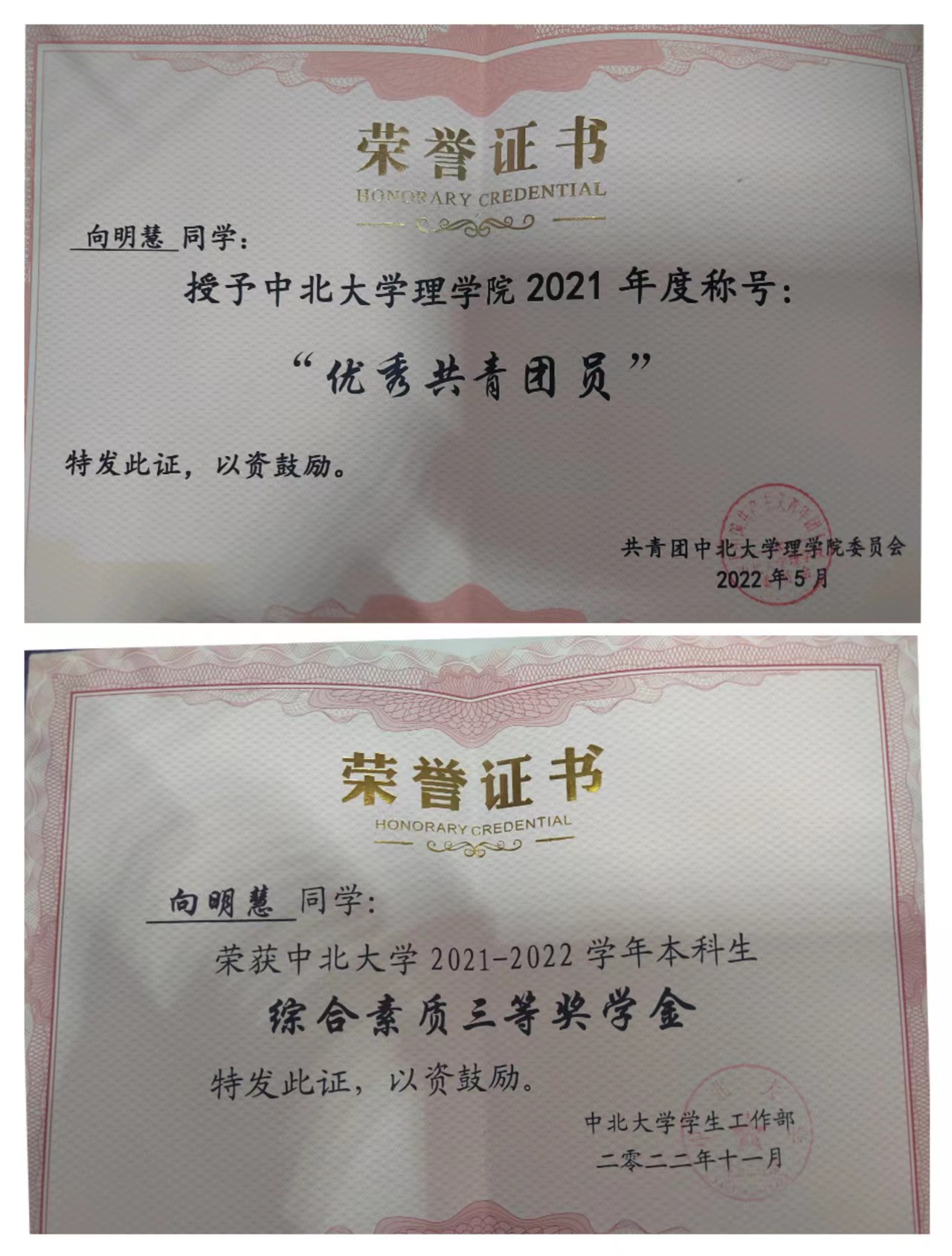 向明慧,女,湖南湘西人,共青团员,半导体与物理学院应用物理学21080741班学生。学分绩点3.36,综测排名13/94。曾获院级优秀共青团团员,综合素质二等奖学金,综合素质三等奖学金,国家励志奖学金。曾任半导体与物理学院助学部副部兼任生活部副部,现任助学部部长。
