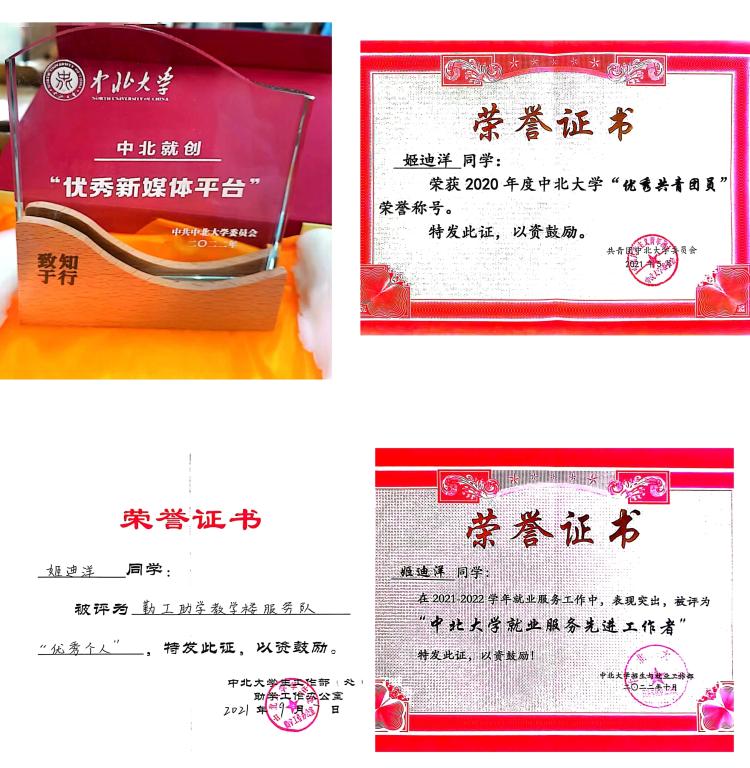 大一时期,我担任班级团支书,积极完成本职工作,配合老师,完成学校的各项工作,在班级成员的共同努力下,带领班级获得了“优良学风班”和“先进团支部”的荣誉称号。大二、大三学年,我加入了中北大学职业发展协会,作为协会主席团成员,协助会长管理协会。在职期间,“中北就创”公众号粉丝6.5w+,用户阅读数据高达187.4w,获得“优秀新媒体平台”称号。我始终踏实负责,善始善终,坚持服务同学,做好自己的每一项工作。