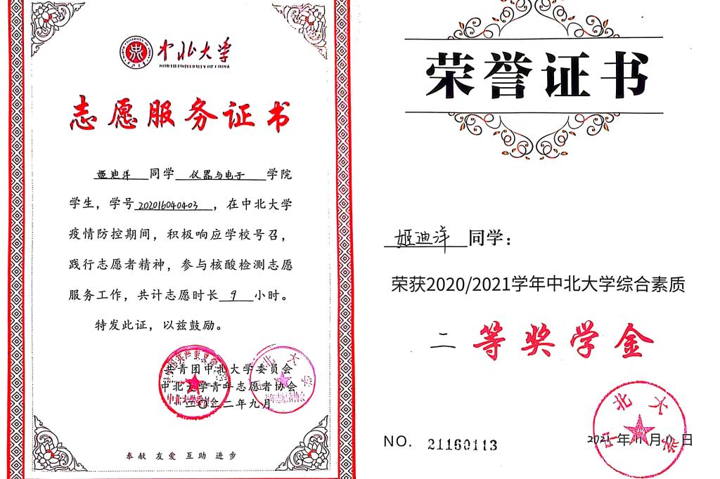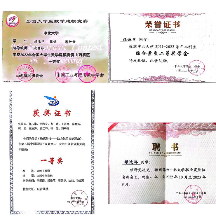 课余时间,我参加各种学校志愿活动和挑战杯、全国大学生数学建模等比赛,培养自己的实践创新能力。在过去三年,我获得了中北大学优秀共青团员、勤工助学优秀个人、志愿服务证书、第八届“互联网+”一等奖、大学生数学建模竞赛山西省一等奖、多次获得中北大学就业服务先进工作者、综合素质二等奖学金、国家励志奖学金。现已通过中北大学本硕贯通计划,成功保研中北大学。