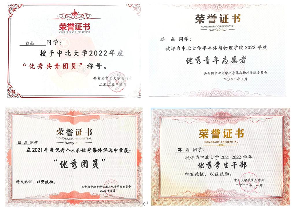 路晶,中共党员,山西省太原人。半导体与物理学院微电子科学与工程20060343班学生,现担任班级组织委员。加权绩点3.92,专业排名8/146。曾获得中北大学优秀班干部,中北大学三好学生,国家励志奖学金,校级优秀团员,综合素质一等奖学金等奖项。现已通过中北大学本硕贯通计划,成功保研中北大学。