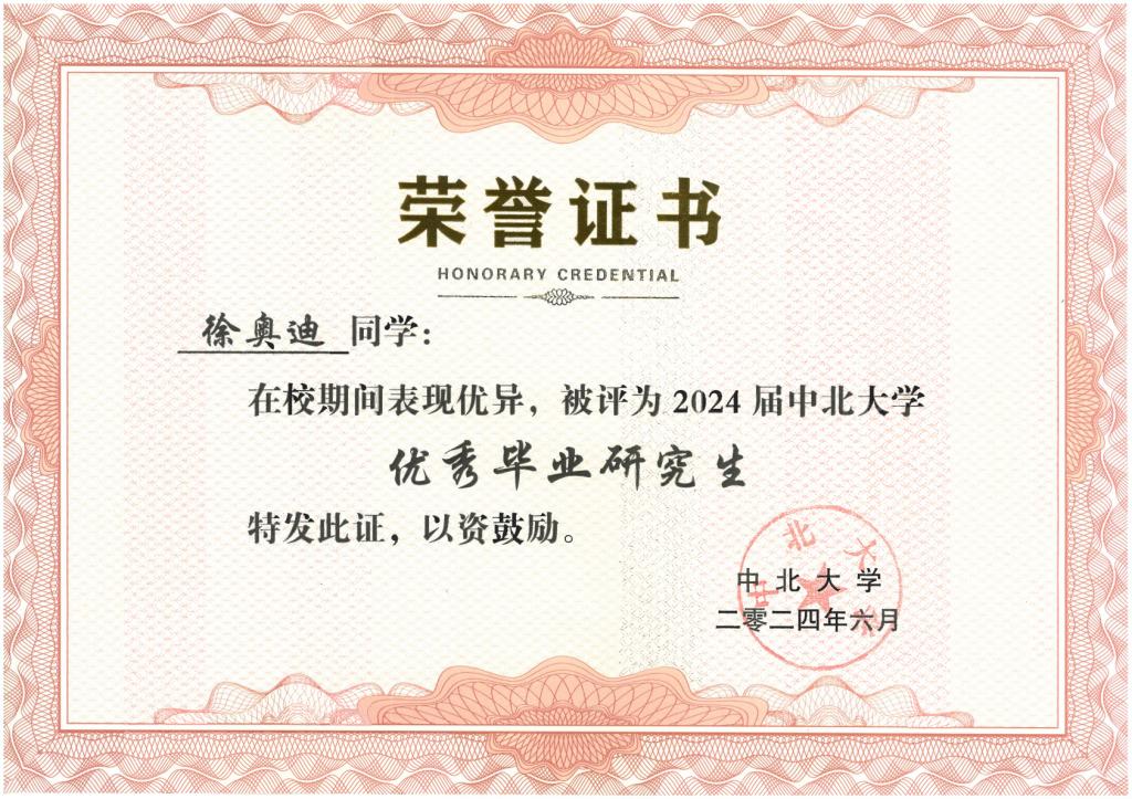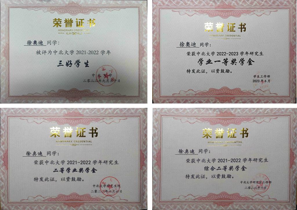 徐奥迪,男,汉族,中共党员,安徽宿州人,中北大学半导体与物理学院电子信息专业2021级硕士研究生,获得优秀毕业生。