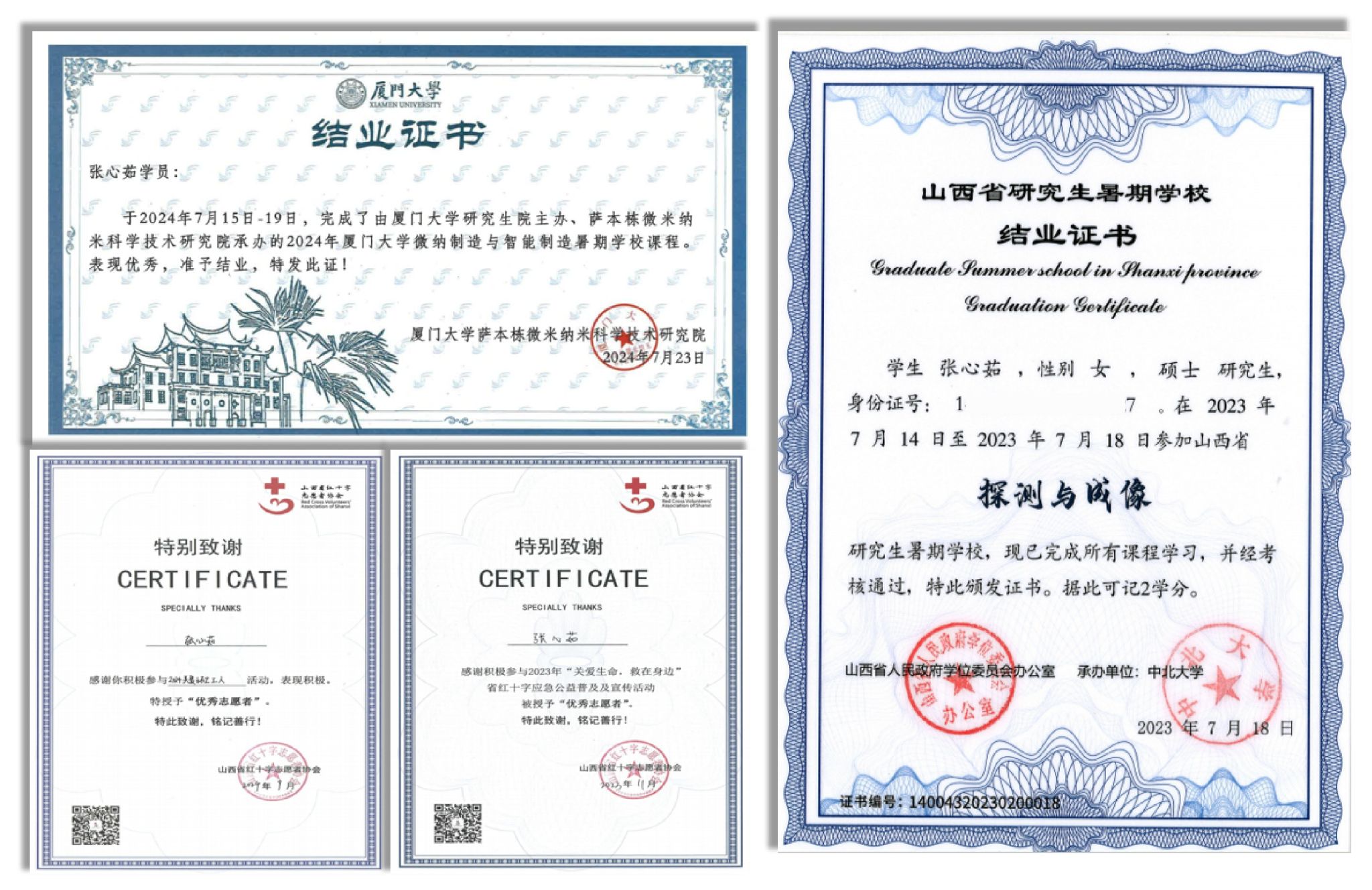 学术研究不应囿于实验室,更需要广阔的视野与深厚的社会责任感。为此,我积极参加厦门大学和山西省组织的暑期课程与学术交流活动。这些经历让我跳出熟悉的科研环境,接触到不同团队的研究思路,了解了领域内更前沿的发展动态,进一步拓宽了学术视野与思维方式。我始终相信,知识的价值在于服务社会。在科研与学习之余,我积极投身志愿服务,累计时长达到 632 小时,两次荣获 “优秀志愿者” 称号。这份认可让我更加坚定了用专业知识回馈社会的信念,也让我对科研工作的社会意义有了更深刻的理解。