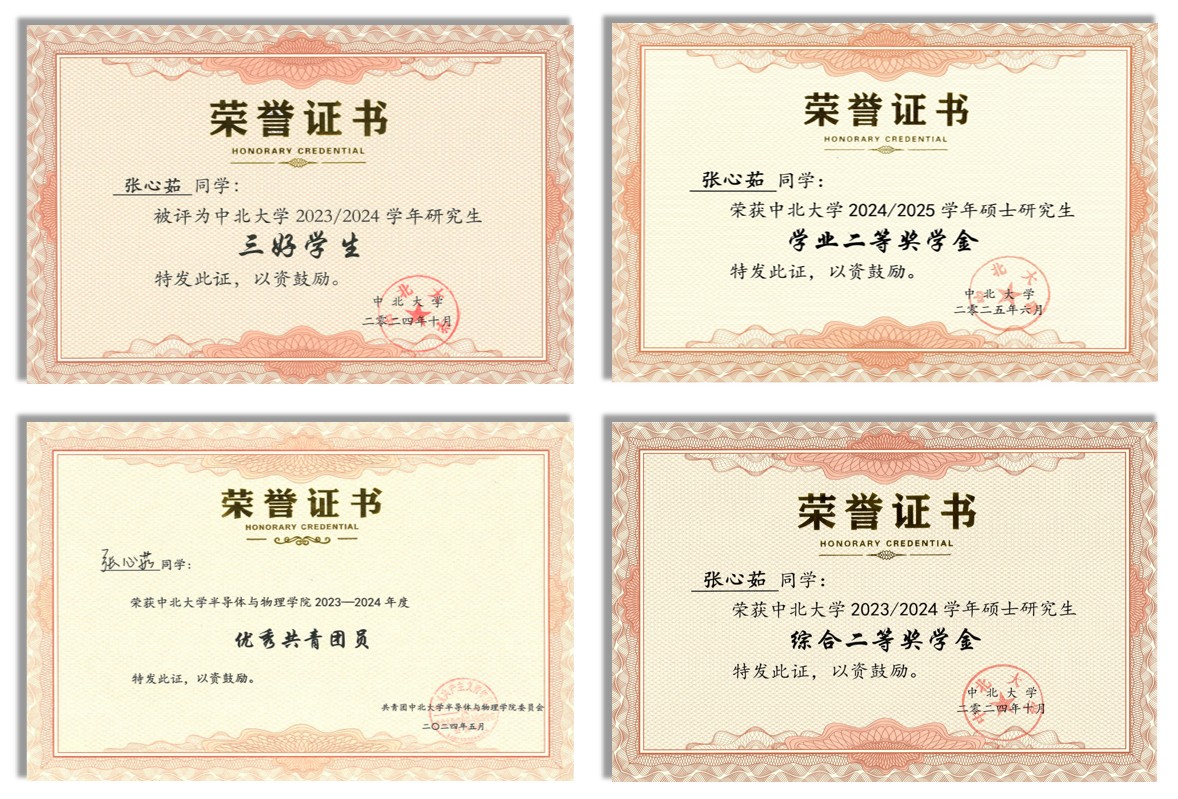 张心茹,山西吕梁人,中北大学半导体与物理学院电子科学与技术专业Y231901班硕士研究生,研究方向为气体传感器及其补偿技术,聚焦于气体传感与传感器集成系统,致力于面向环境监测、健康医疗等领域的高精度、高稳定性智能气体传感系统研发。研究生期间,我作为核心成员,参与多项科研项目,国家自然科学基金青年项目、国家02专项等项目。在科研实践中,我系统掌握了传感器设计、仿真、制备、封装与测试全流程能力。学术上,我以第一作者在Sensors and Actuators B: Chemical发表论文一篇,并拥有一项发明专利已授权。积极投身公益实践,累计志愿服务632小时。我也积极参与“互联网+”、全国大学生机械工程创新创意大赛等赛事并获奖。