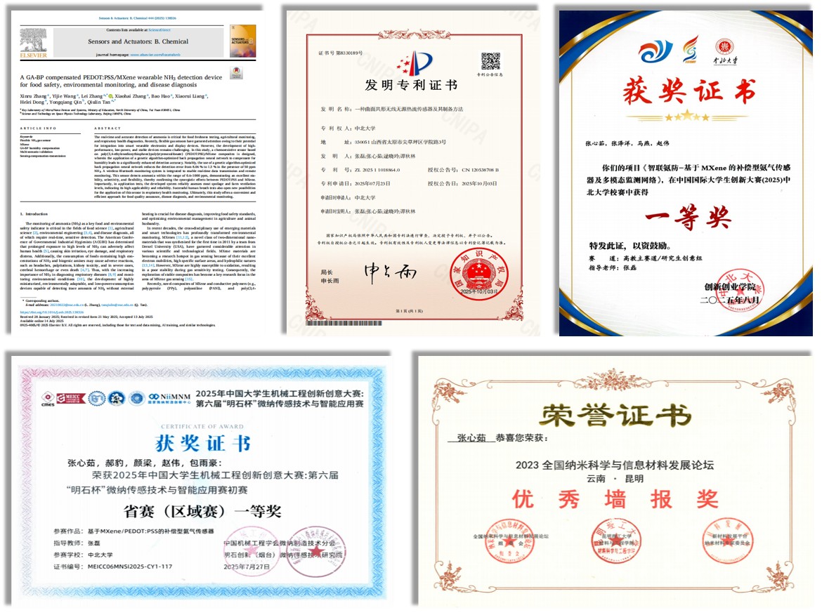 我的科研方向聚焦于气体传感器及其补偿技术。在张老师的引领下,我系统掌握了从理论到实践的完整科研链条。在科研项目方面,我有幸参与国家自然科学基金青年项目等高水平课题。通过项目研究,我锻炼了独立解决复杂科学问题的能力,掌握了传感器结构仿真与优化方法,完成了传感器的设计与性能测试,并深入研究了基于算法与硬件电路的温湿度补偿技术,显著提升了传感器的实用性与可靠性。在学术成果方面,经过多轮实验迭代与分析,我以第一作者身份在《Sensors and Actuators B: Chemical》发表论文一篇。同时,一项关于热流传感器及其制备方法的发明专利已获得授权。此外,我积极参加学术交流,在全国纳米科学与信息材料发展论坛上荣获优秀墙报奖。在学科竞赛中,我将科研所学应用于创新实践。在 “互联网 +” 和中国大学生机械工程创新创意大赛中,从研究思路、技术实现到计划书撰写和现场答辩,我全面提升了创新思维、项目管理能力与团队协作精神。