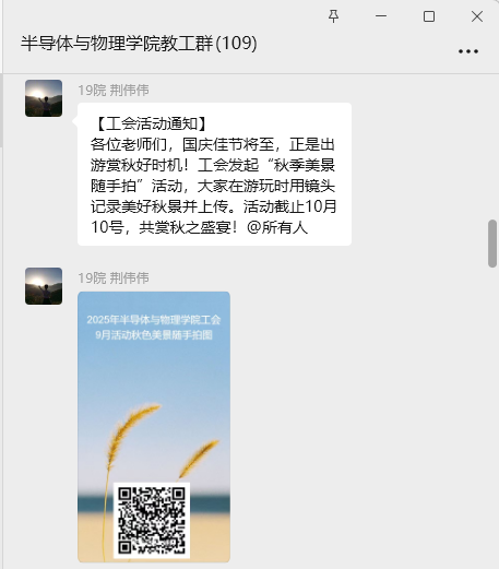 为庆祝中华人民共和国成立74周年,丰富教职工精神文化生活,半导体与物理学院工会于2025年9月28日启动“秋季美景随手拍”摄影活动,邀请全院教职工在国庆黄金周期间,用镜头捕捉祖国大地绚烂秋色,共享秋之盛宴。活动一经发出便得到热烈响应,短短三天,工会邮箱已收到近百幅投稿:银杏掩映的校园晨读、校园内的金黄柿子树、汾河老龙头景区的音乐喷泉、最美迎泽大街打卡夜景……一幅幅鲜活画面,既展现了祖国南北壮美的生态画卷,也折射出教职工发现美、记录美、传递美的生活态度。