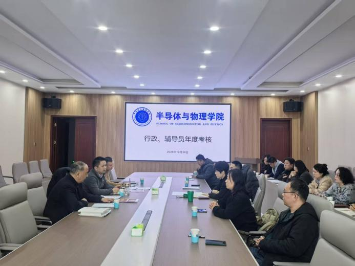 为全面总结2025年度工作成效,凝聚发展共识,规划来年工作方向,12月30日,中北大学半导体与物理学院在半导体大楼332会议室召开2025年度行政、辅导员考核大会。院党委书记李仰军、院长唐军、副书记荆伟伟、副院长梁庭及教师代表等出席,全体行政人员、辅导员参加。