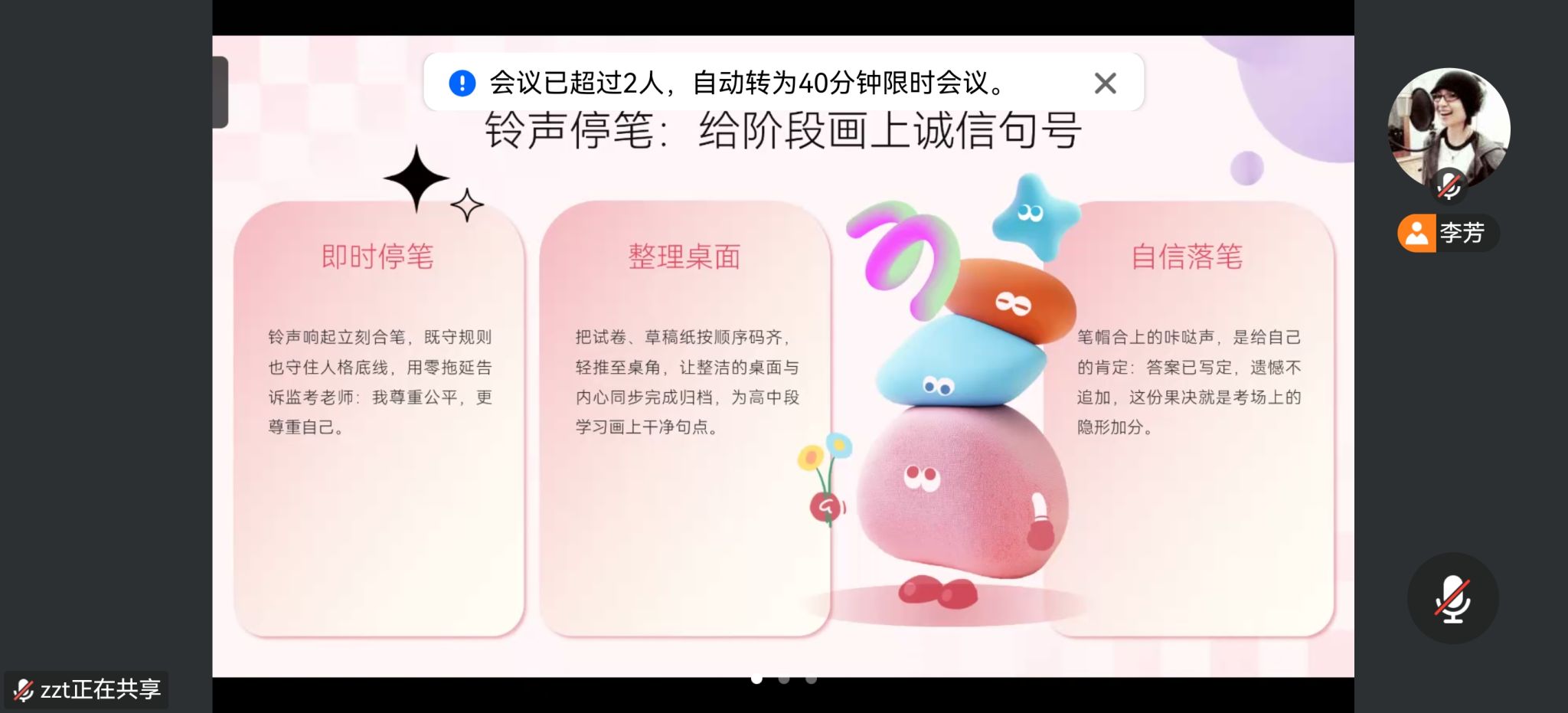 为深入贯彻“三全育人”理念,筑牢学术诚信根基,2026年1月13日晚,李芳老师在主楼1110组织开展了“翻过去·翻开来:再启程”专题教育活动。导师聚焦大一、大三学生混龄学生两大群体精准施策:面向初识大学考场的大一新生,系统讲解答题卡填涂、停笔铃响、草稿纸回收等易错环节,用真实违规案例敲响诚信警钟;面向即将奔赴研考战场的大三学子,梳理时间分配失衡、证件消磁、情绪崩盘等高频痛点,给出倒计时模拟、应急办证、深呼吸脱敏等破解方案。期末将至,导师再次叮咛:归途抢票认准官方渠道,行李前背、拒绝黑车,让平安先到家;新年将至,预祝全体同学新春快乐,阖家团圆,把好成绩与好心情一起带回家!