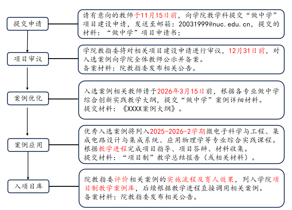 为进一步落实教务部关于“做中学”项目建设的工作部署,提升我院相关专业“做中学”题目库质量与数量,现向我院全体教师征集可作为“项目制”教学案例。优秀入选案例将列入2025-2026-2学期,微电子科学与工程专业、集成电路设计与集成系统专业、应用物理学综合实践课程。