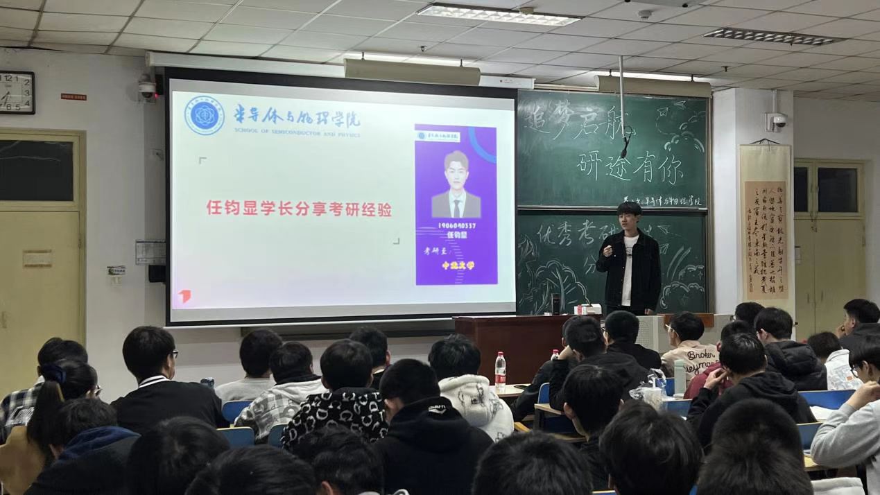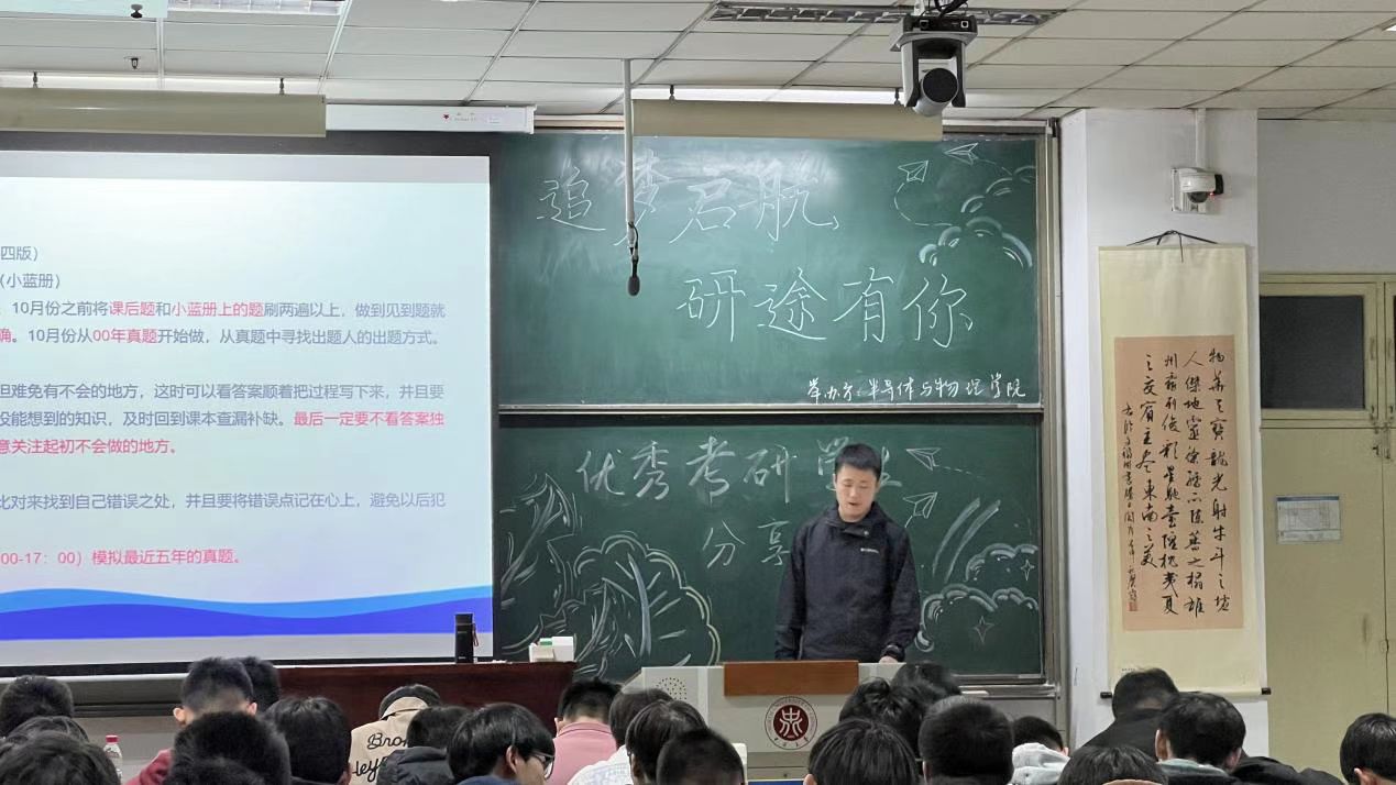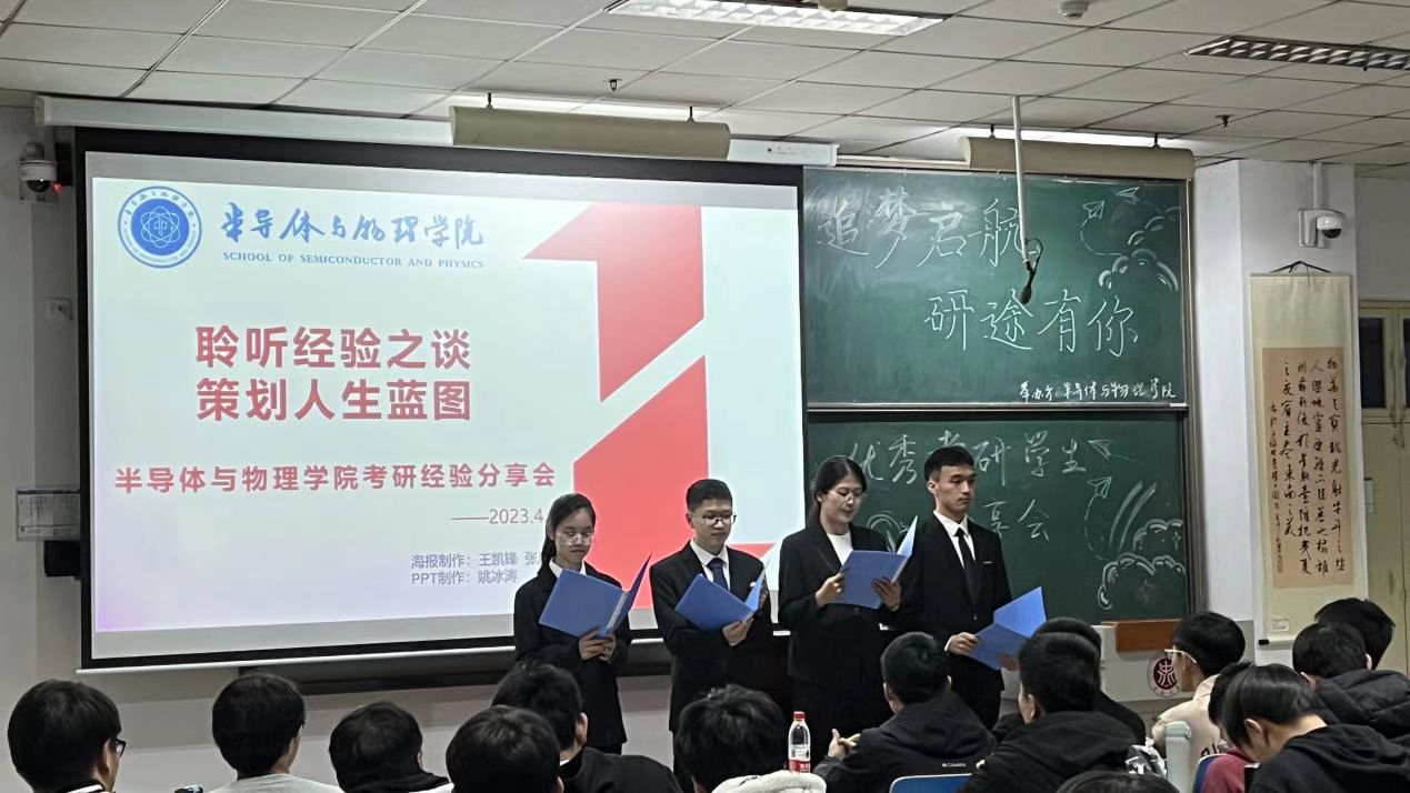 2023年4月25日晚上7:30,半导体与物理学院“追梦启航 研途有你”优秀考研学生分享会在11112教室举行。活动邀请了考研成功上岸的学生代表任钧显、邢新泽、郝晋华、李星宇为同学们分享了他们宝贵的学习经验,大一、大二学生积极踊跃参加了本次活动,活动由周远乐、王鑫琦、李佳芮与赵君正四位同学主持。