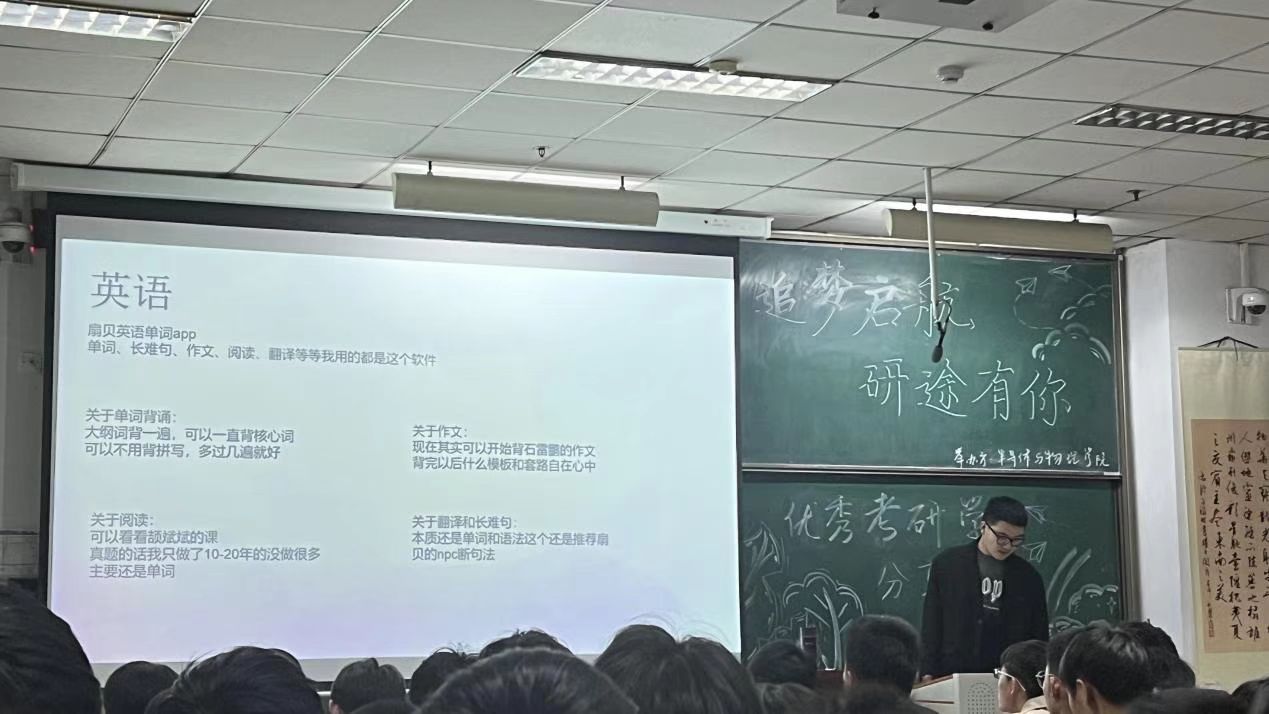 分享会在热烈的掌声中拉开帷幕。考研是升学的一种途径,为了让同学们在考研路上走得更顺利,四位考研成功上岸的学长用自己的亲身经历及丰富经验为同学们指点迷津。