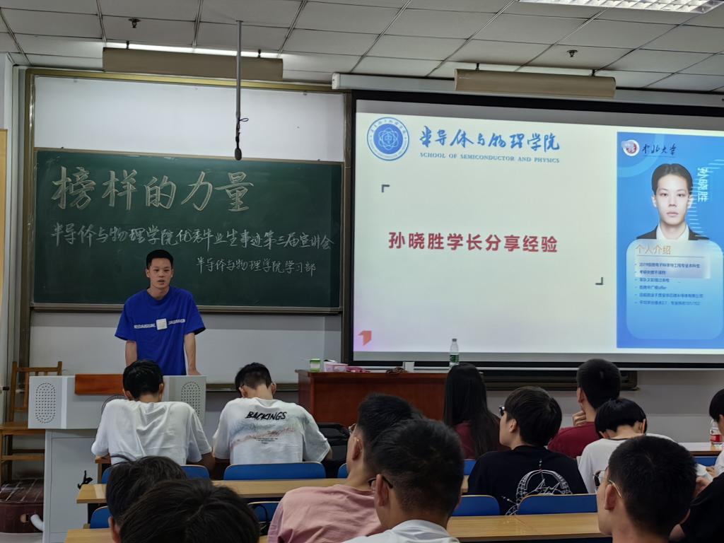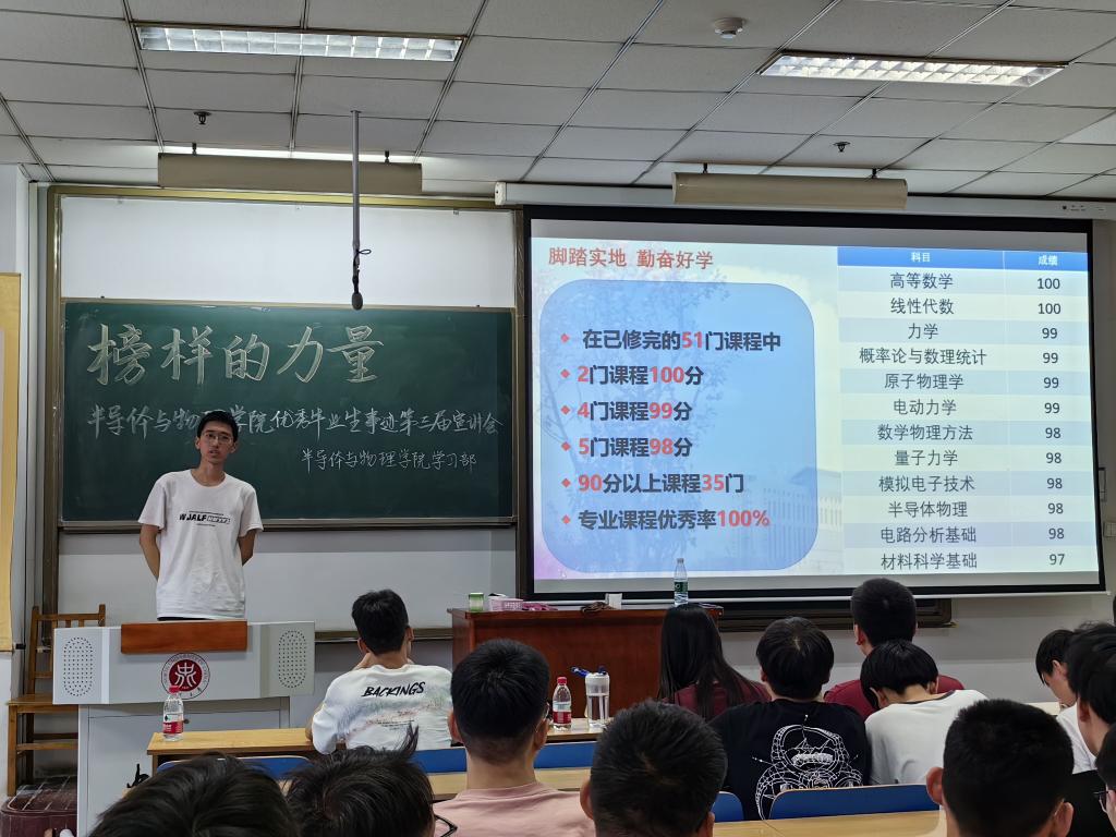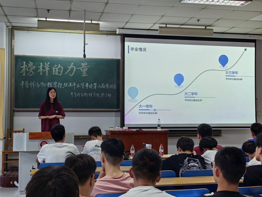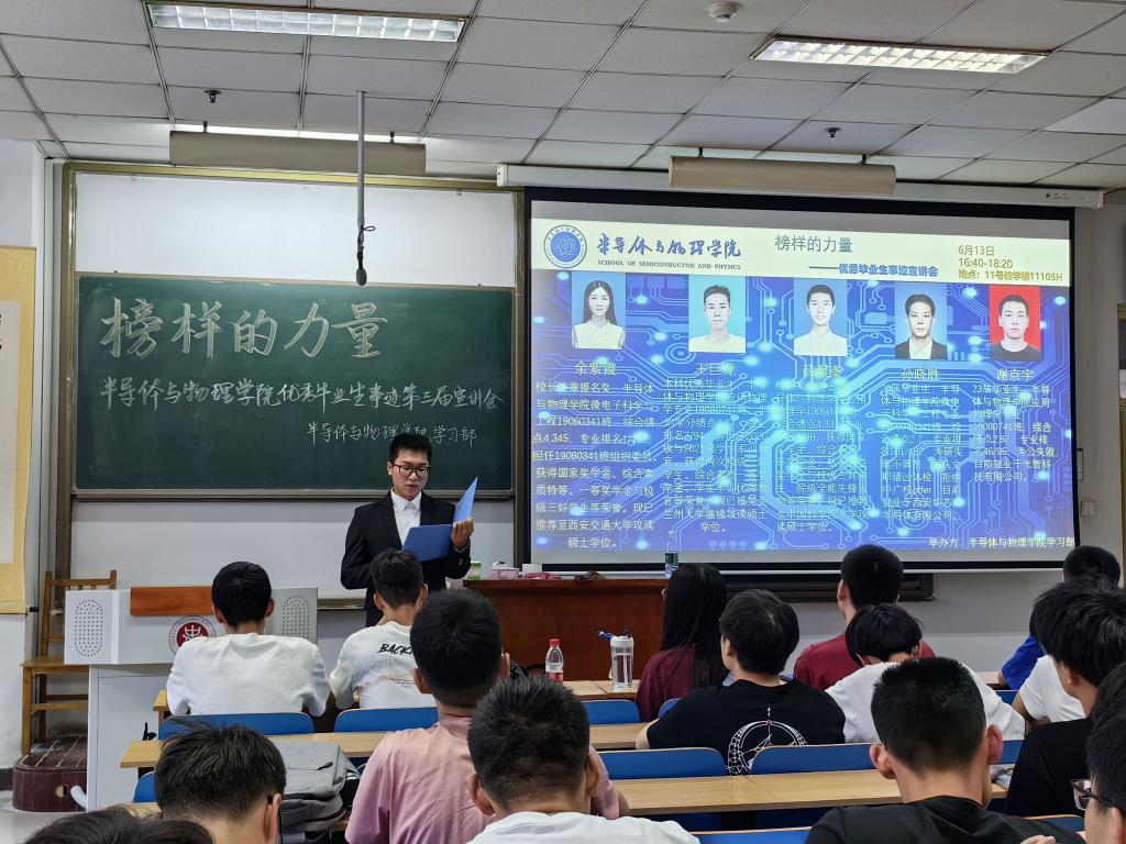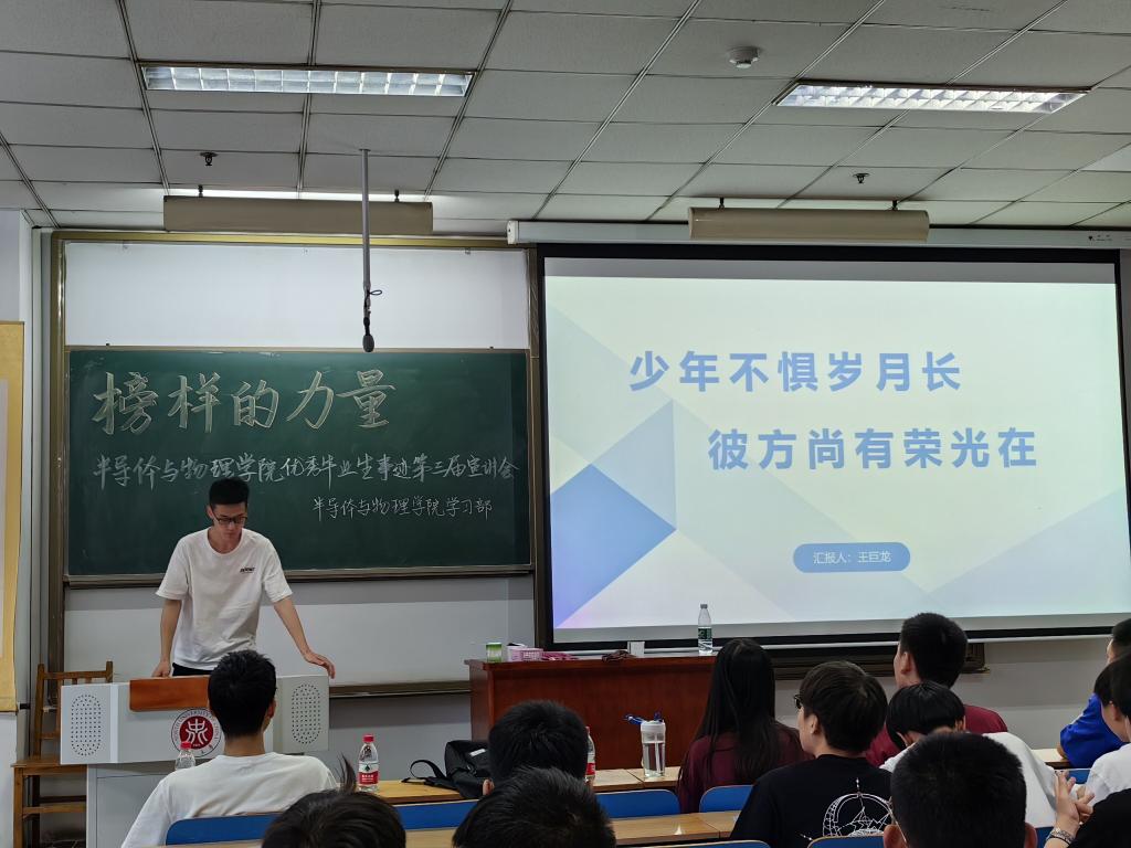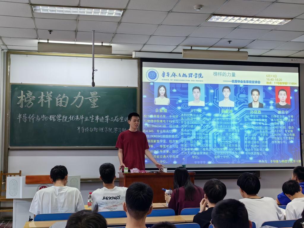 2023年6月13日下午,在11105教室,半导体与物理学院成功举办第三届优秀学生事迹宣讲会--榜样的力量。本次活动邀请了优秀毕业生余紫霞、王巨龙、薛景泰、孙晓胜、谢京宇作为出席嘉宾,大一、大二学生参加了本次活动,活动由王浩然同学主持。