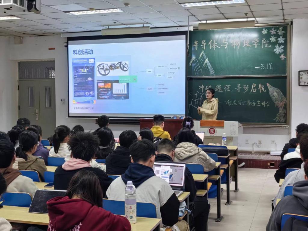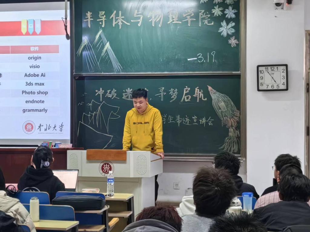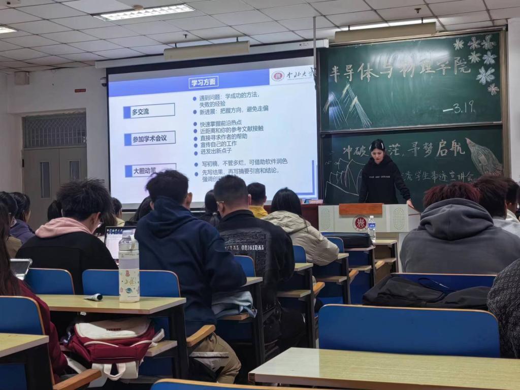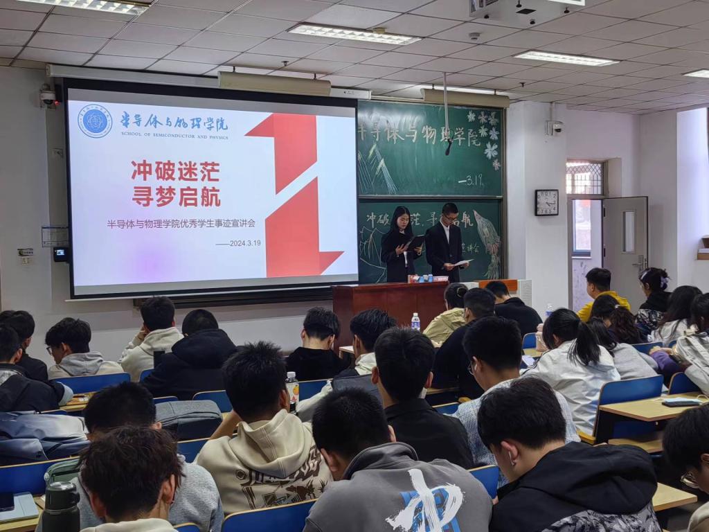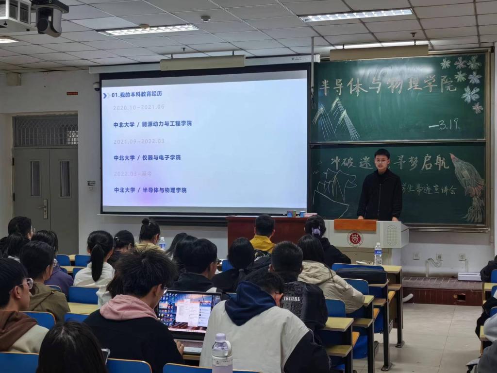为了充分发挥学生典型的榜样示范和朋辈教育作用,激发我院学生的学习激情,冲破大学生活中的迷茫,引导广大学子学习榜样、争做先锋,2024年3月19日下午四点,半导体与物理学院在11112H教室举行了“冲破迷茫,寻梦启航”的优秀学生事迹宣讲会。本次活动邀请了我院4名优秀学生,分别是获得2023年国家奖学金的同学:刘柯柯、王嘉慧、甄明硕;获得中北大学校长奖章提名奖的同学:王舒畅。他们向学弟学妹们分享了自己的宝贵学习经历和大学成长经验。此次活动由学习部干事张树轩和黄力代两名同学主持。