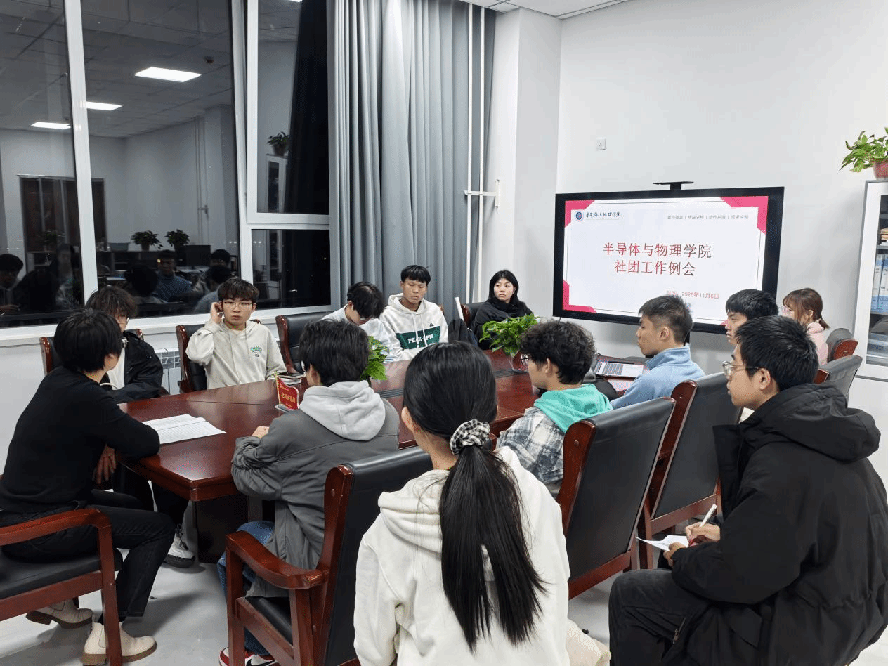 2025年11月8日,中北大学半导体与物理学院召开社团工作例会,会议由学院团委副书记王旭主持,阳光网球社、萌芽剧社、AIGC中北、物理协会四家社团负责人参会。